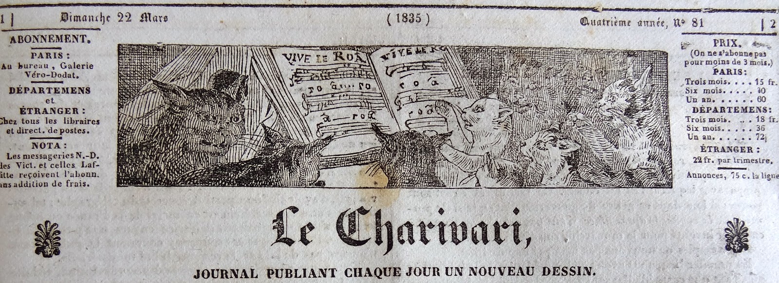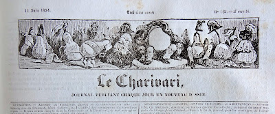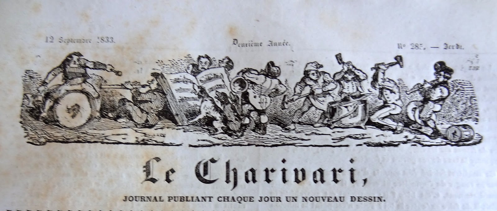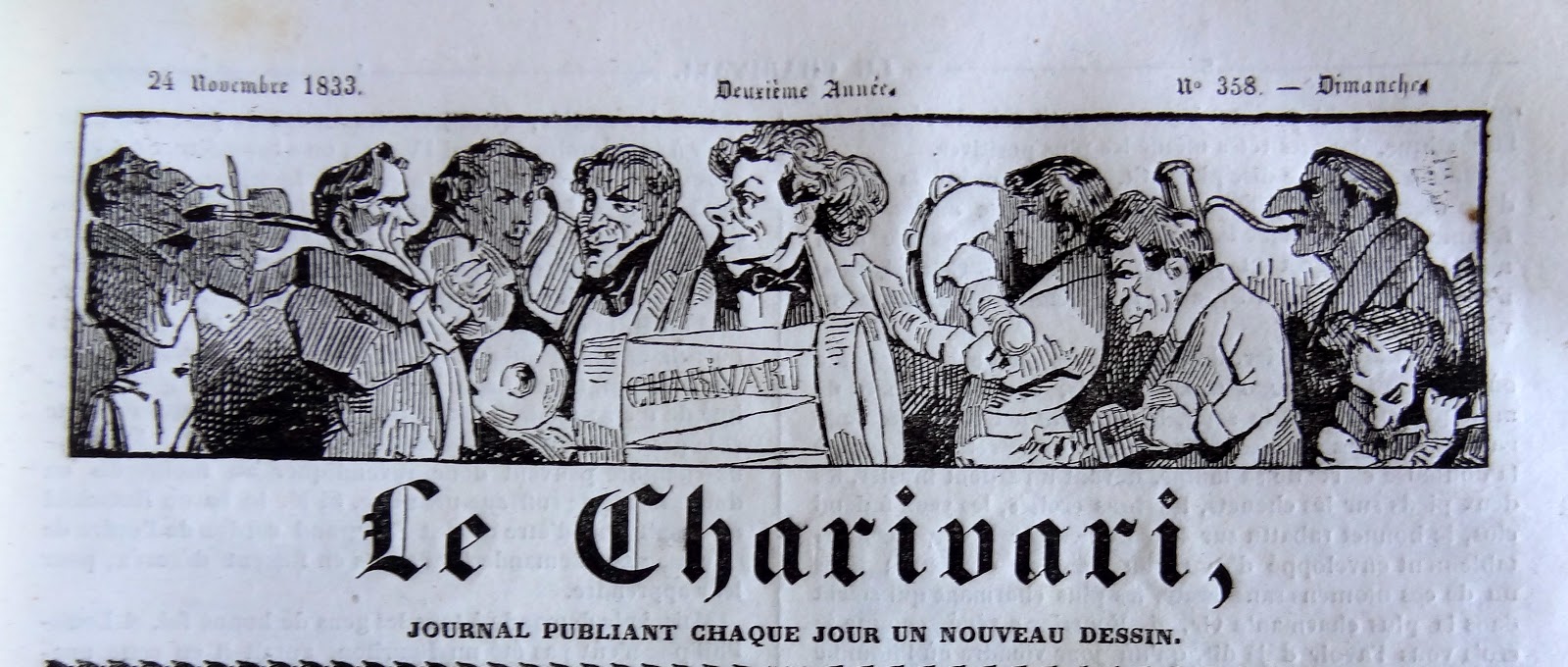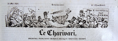 On peut rapprocher le dessin de ce bandeau de celui paru le 18 Avril 1833, dans la Caricature N° 128, ce journal frère du Charivari. ( Le Règne Animal , pl. couleurs 265 & 266).Les