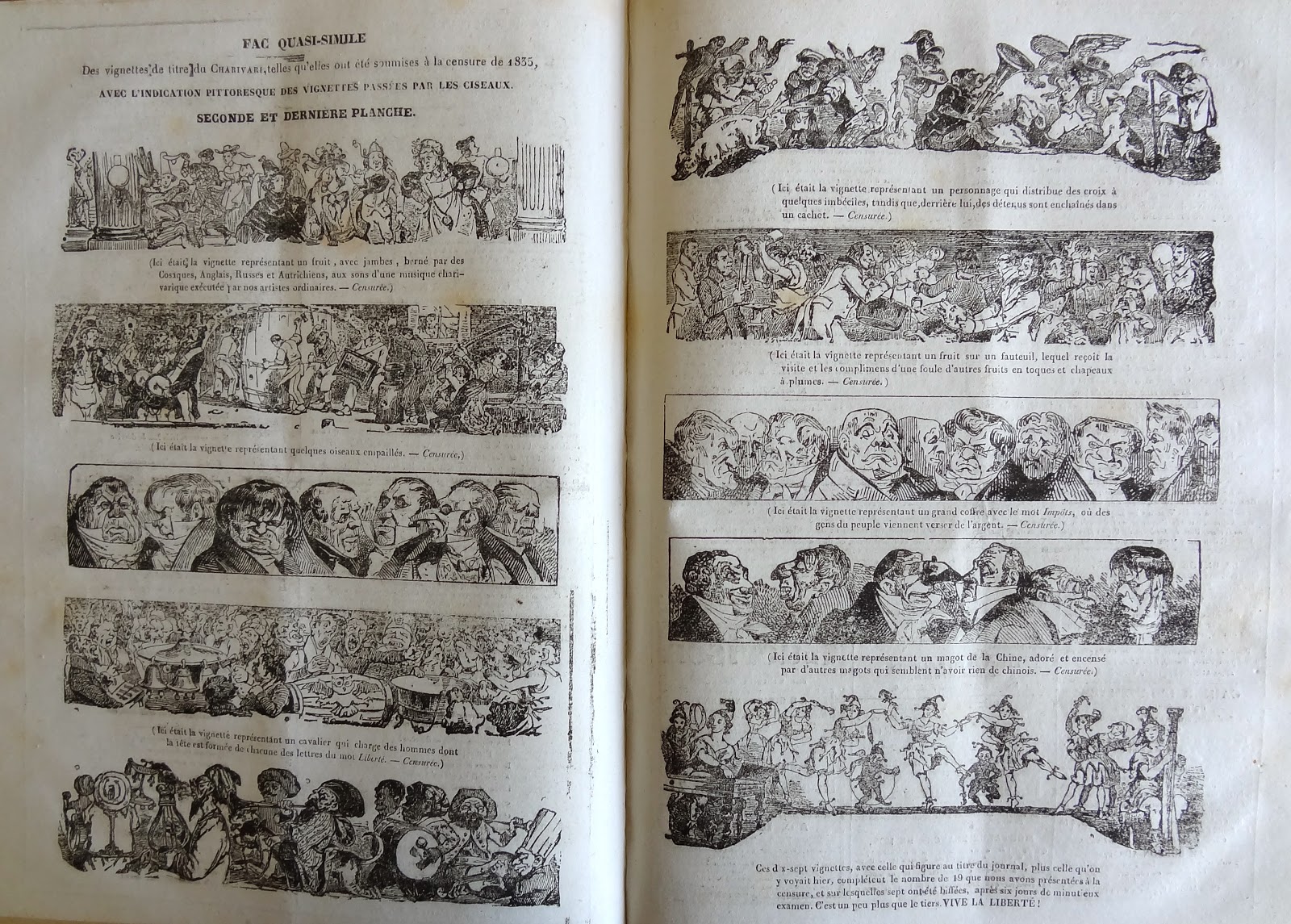 " Fac quasi-similé de vignettes de titres du Charivari, telles qu'elles ont été soumises à la censure de 1835"