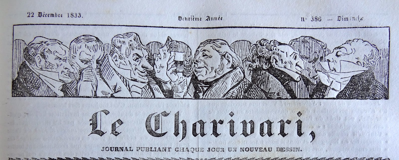 Bandeau N° 17 : Parution le Dimanche 22 Décembre 1833. Une vignette au format 17,5 x 3,5 dessinée par Daumier. Portraits-charges de 8 personnages dont 5 en premier plan.