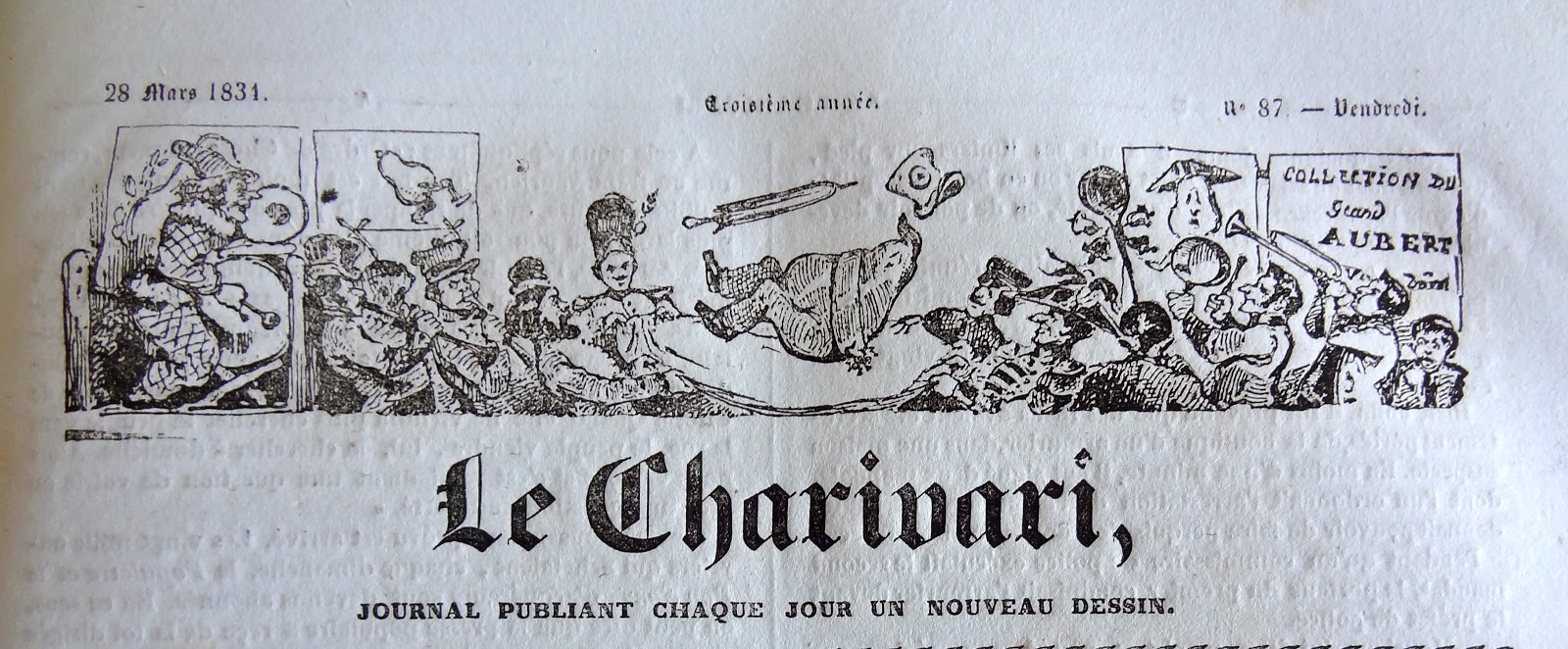 frappant sur une casserole ou en jouant d'instruments. Le bandeau finit par une affiche-réclame pour les productions d'Aubert , le beau-frère de Philipon et grand imprimeur de lithographies au