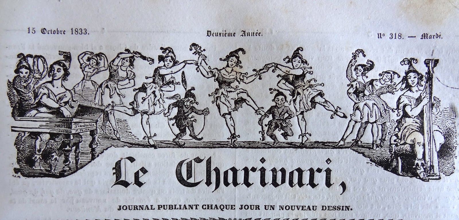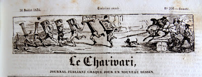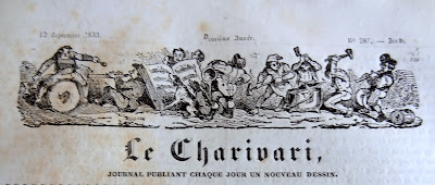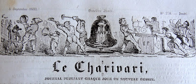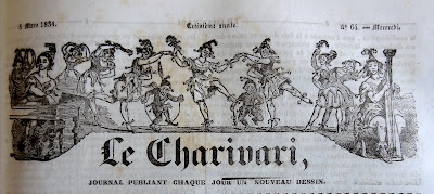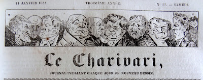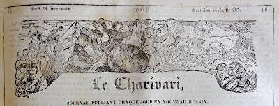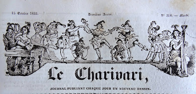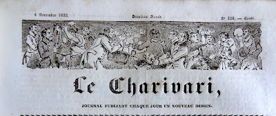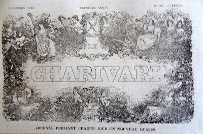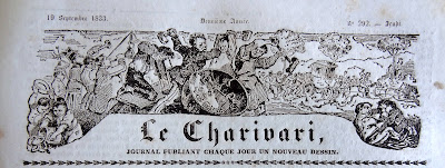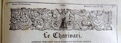 On doit cette très intéressante présentation des bandeaux du Charivari au bibliophile et expert en livres anciens Bernard Mamy, auteur du blog Cartonnages romantiques qui comporte de