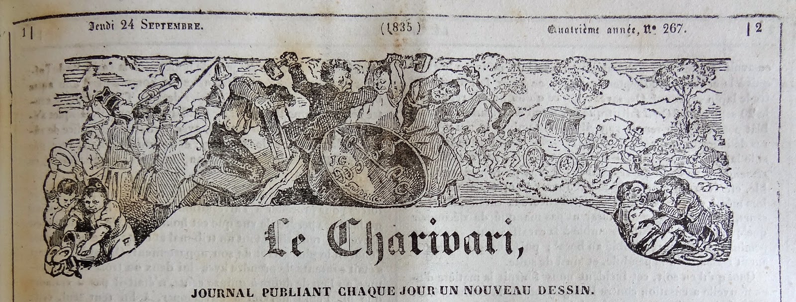 Bandeau N° 2 : Parution le Dimanche 1er Septembre 1833. Une vignette au format 17x 3,5 dessinée par E.F.( Eugène Forest, je présume). Première planche voulant illustrer le tohu-bohu, des